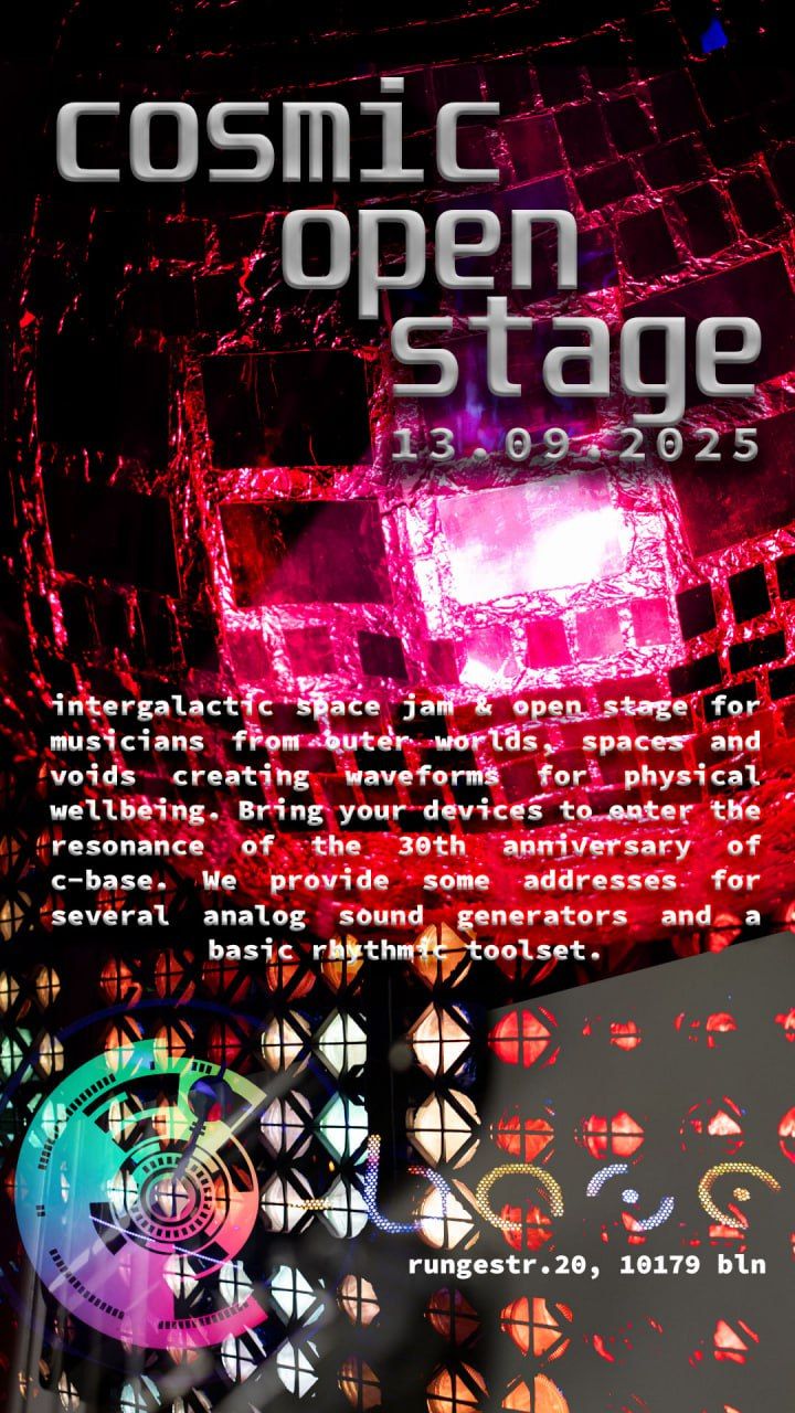 intergalactic space jam & open stage for musicians from outer worlds, spaces and voids creating waveforms for physical wellbeing. Bring your devices to enter the resonance of the 30th anniversary of c-base. We provide some addresses for several analog sound generators and a basic rhythmic toolset.
